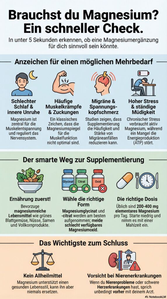 | Magnesiumglycinat | Hoch | Aminosäurebindung erhöht Absorption | Nervengesundheit, Schlafqualität, Stressabbau |