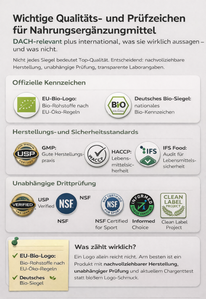 Bio sagt etwas über Herkunft, GMP und HACCP über Prozesse, Drittprüfungen über definierte Kontrollstandards. Keines dieser Zeichen ersetzt automatisch den Blick auf Zutaten, Dosierung und Prüfunterlagen.