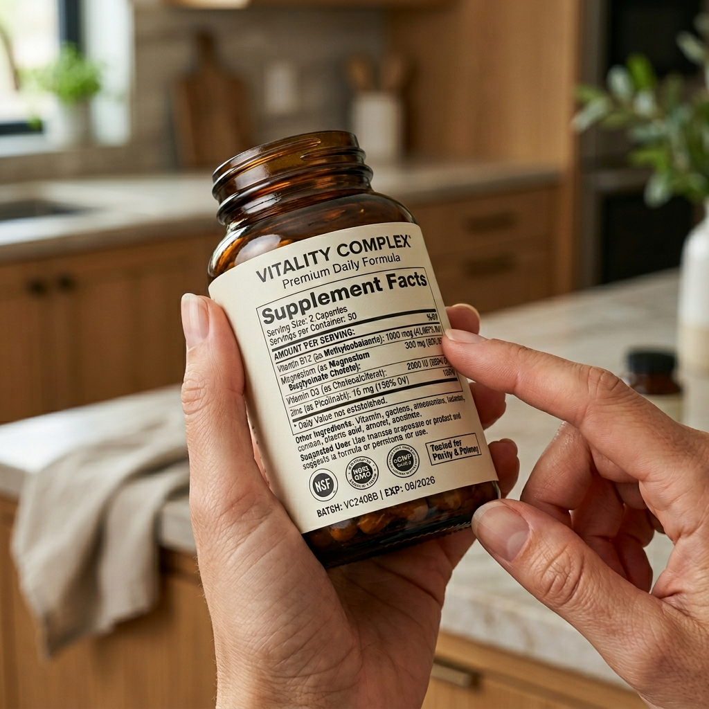 Ein hochwertiges Produkt nennt klare Wirkstoffformen wie Magnesiumcitrat, Methylcobalamin oder Omega-3 mit EPA/DHA-Anteil statt ungenauer Sammelbegriffe.